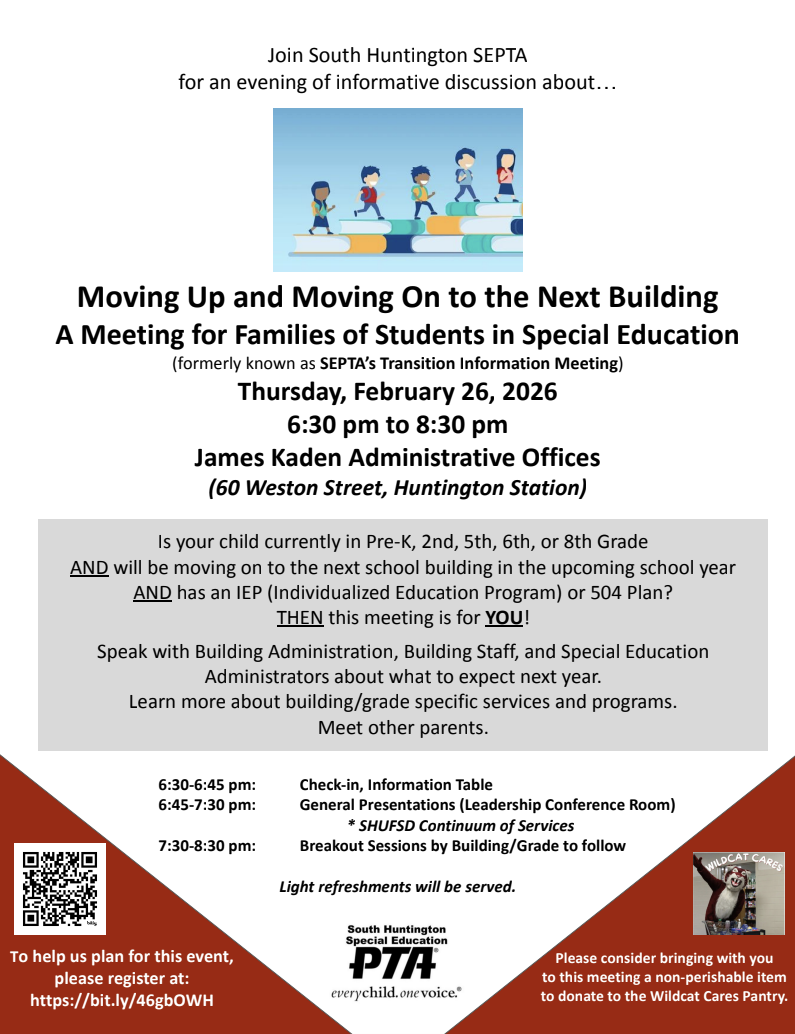 The mission of the South Huntington Community is to empower all children to maximize their potential by teaching them the necessary academic skills and enabling them to develop the positive social and moral skills required to become contributing members of society. We strive to provide all children with a safe and secure environment and a place where everyone is treated with respect.