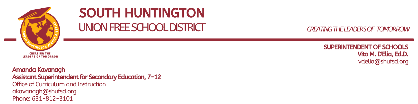 The mission of the South Huntington Community is to empower all children to maximize their potential by teaching them the necessary academic skills and enabling them to develop the positive social and moral skills required to become contributing members of society. We strive to provide all children with a safe and secure environment and a place where everyone is treated with respect.