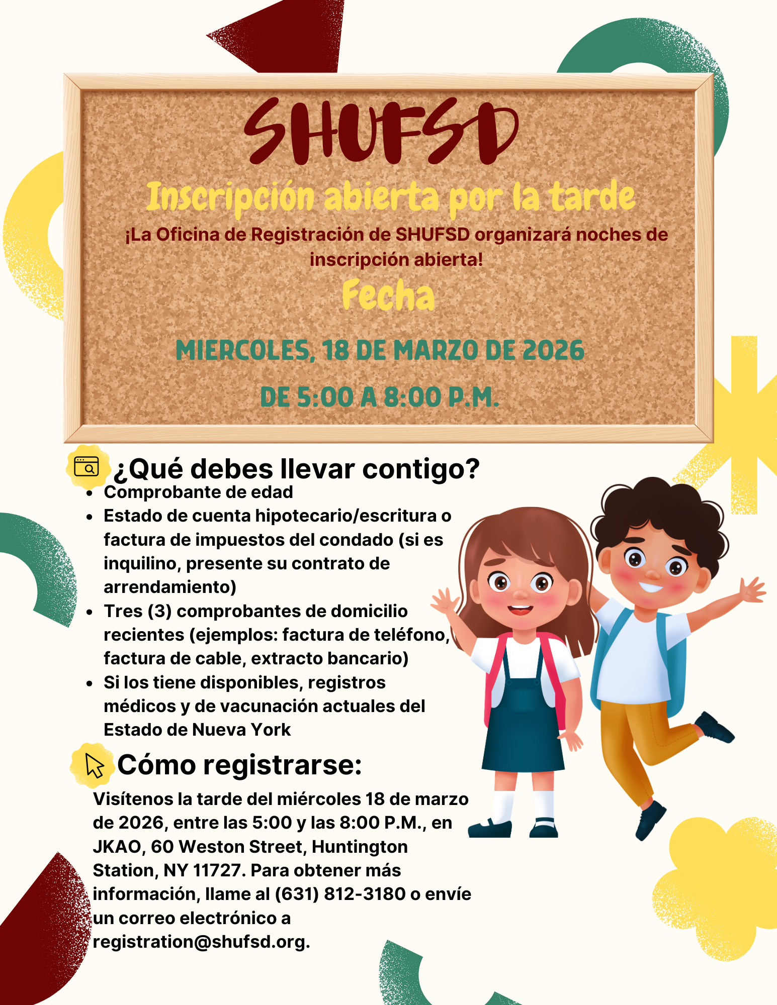 ¿Aún necesita inscribir a un estudiante para el año escolar 2026-2027? Lo invitamos a nuestra Inscripción Abierta Nocturna el miércoles 18 de marzo de 2026. No es necesario concertar cita.
